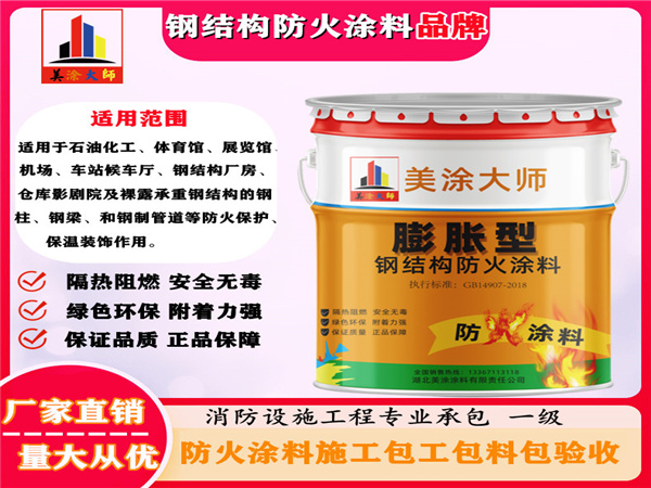 室外超薄型钢结构仁布防火涂料是一种由复合材料、阻燃材料、防火填料等组成,并选用最新型的阻燃剂、发泡、发炭、催化剂等加工而成的新型仁布防火涂料。该涂料涂层薄、用量少、耐火时间长,粘结力强,耐候、抗冲击、耐冻融性好。并具有较好的耐化工大气腐蚀性,涂层遇火时迅速膨胀增厚,形成发泡致密、均匀的隔热层,延长了耐火时间,从而达到防火保护作用。耐火时间根据等级不同可达0.50 h -2.00 h不等。